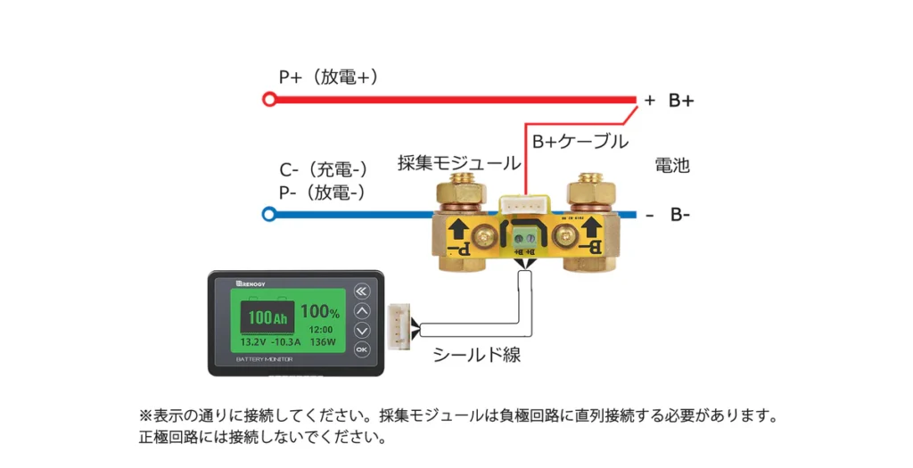 接続図で実際の配線をイメージすると、バッテリーのマイナス端子と採集モジュールを接続するための配線が追加で1本必要になります。