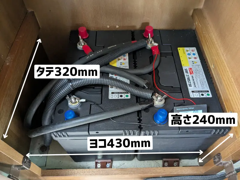 サブバッテリーの収納スペースはタテ320mm、ヨコ430mm、高さ240mmくらい。