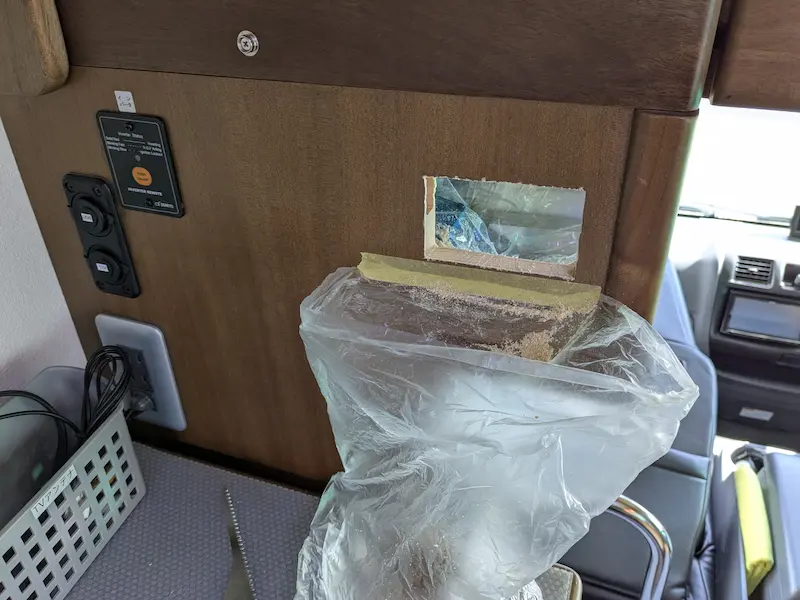 助手席後ろの内装を一部剥がしてモニターの取り付け位置を検討します。壁裏にインバーターや外部充電器が隠されているため、干渉しない位置に決定しました。